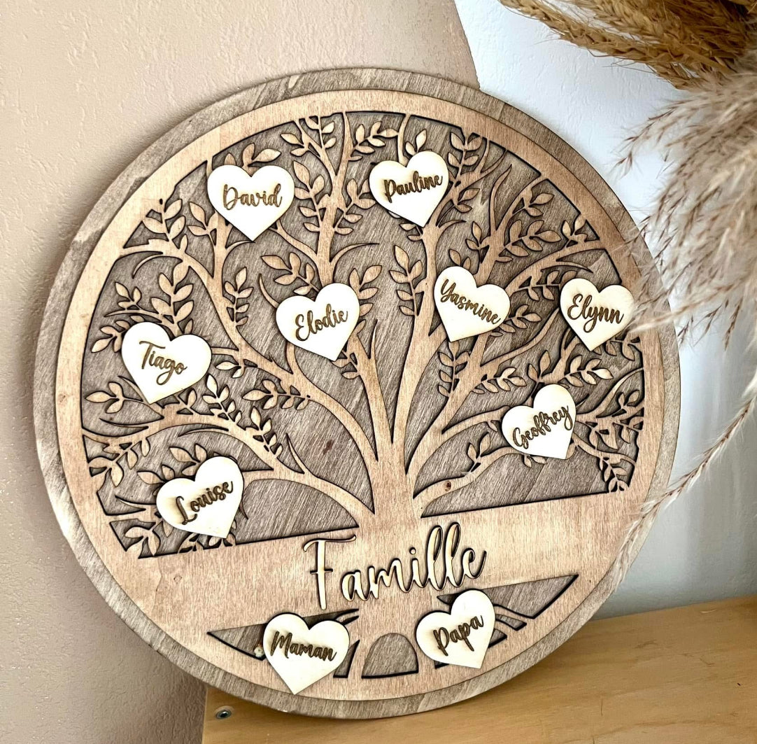Arbre de vie de 27cm environ avec prénom. Vous recevrez dans une pochette les cœurs avec prénom ainsi qu’une colle afin de mettre vous même les cœurs au emplacement que vous désirez.